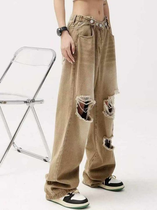 春夏季新款破洞宽松复古直筒阔腿设计款可调节牛仔裤,独立包装带腰卡,码数...
