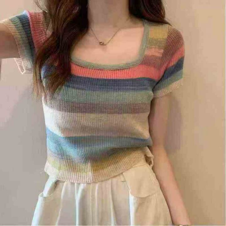 ☕️彩虹条纹方领短袖t恤女冰丝针织短款上衣超好看辣妹T恤156件全清8.8元,...