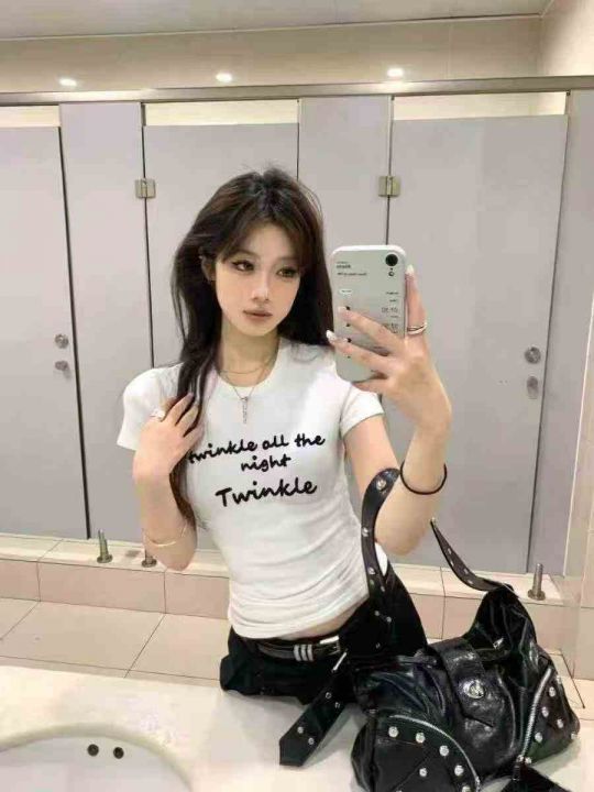 ☕️纯欲风甜辣妹方领正肩短款上衣女修身设计感小众辣妹短袖t恤400件全清6....