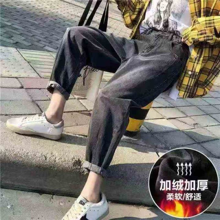 冬季新款加绒牛仔裤女宽松大码高腰直筒外穿阔腿老爹长...