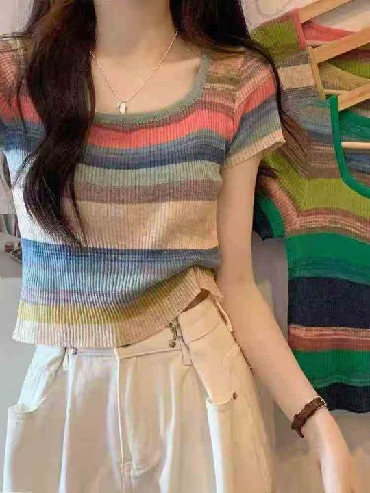 ☕️彩虹条纹方领短袖t恤女冰丝针织短款上衣超好看辣...