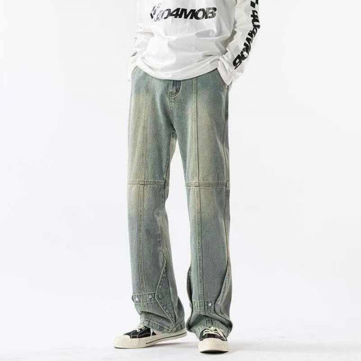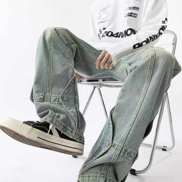 春季新款网红复古男士洗水棉美式高街排扣设计感直筒微...