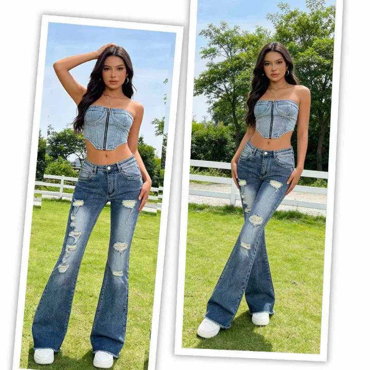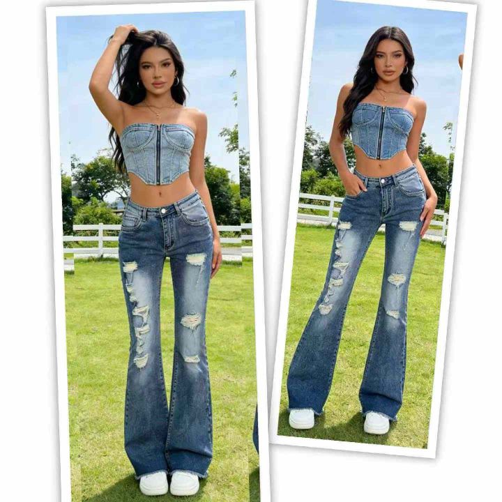 春夏季新款品牌外贸原单美式宽松高弹力洗水棉破洞牛仔微喇叭裤,独立包装,码数S- 2XL码,140件左右,全清13.8元超低价秒杀!