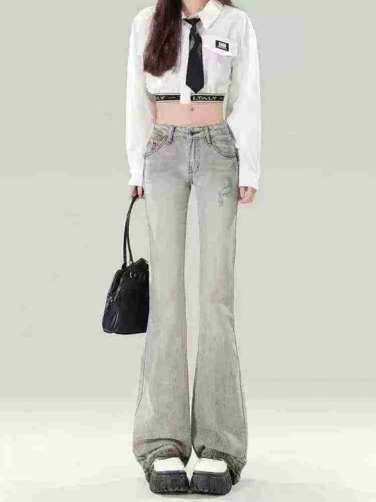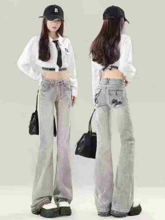 ☕️美式辣妹微喇叭牛仔裤女新款显瘦刺绣拖地马蹄裤子...