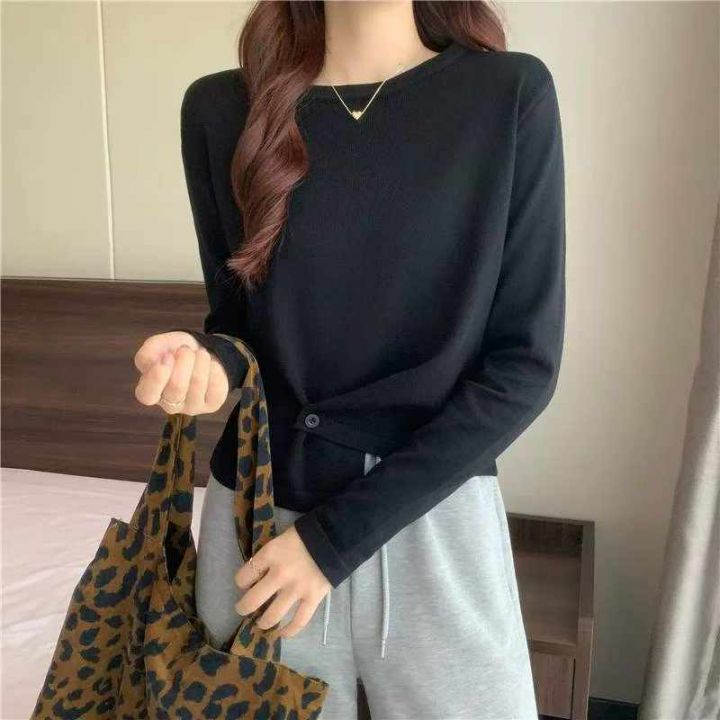 春季新款韩系风净版设计感不规则下摆圆领长袖针织衫,...