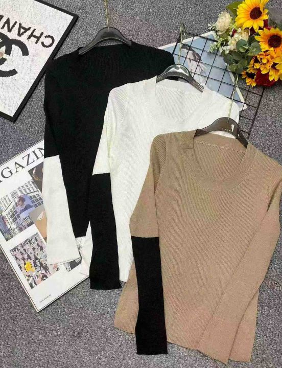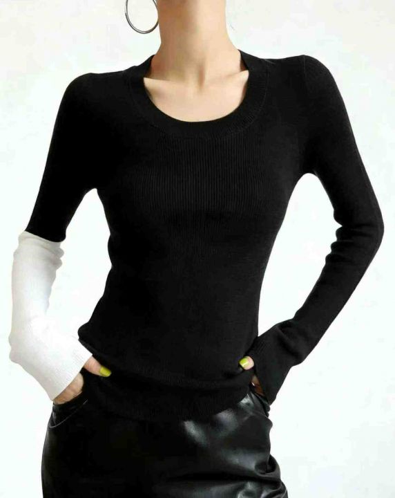 秋冬新款设计款撞色坑条弹力修身显瘦长袖针织打底外穿...