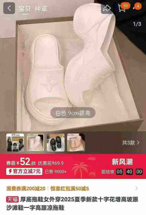 3️⃣天猫在售爆款9cm厚底增高十字花踩屎感新款松糕一字凉拖鞋1710双,两个款3个色(两个款鞋面上的图案有区别/鞋底有区别),码数35-40,独立包装,有码数颜色清单,全清5.8元捡漏秒杀,分货200双起7.8元