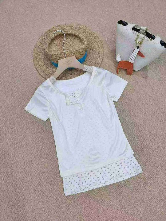[月亮]:蕾丝花边假两件拼接碎花辣妹T恤