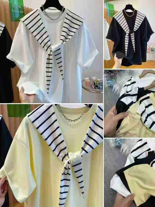 全清价5.9设计感条纹 短恤T恤女夏宽松显瘦通勤风上衣2...