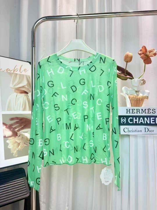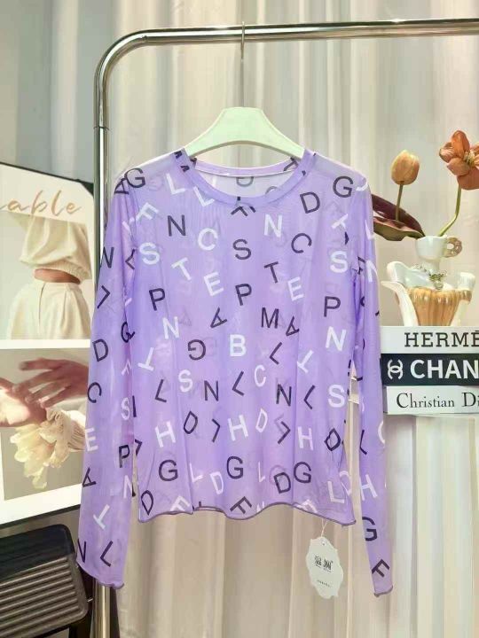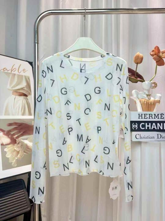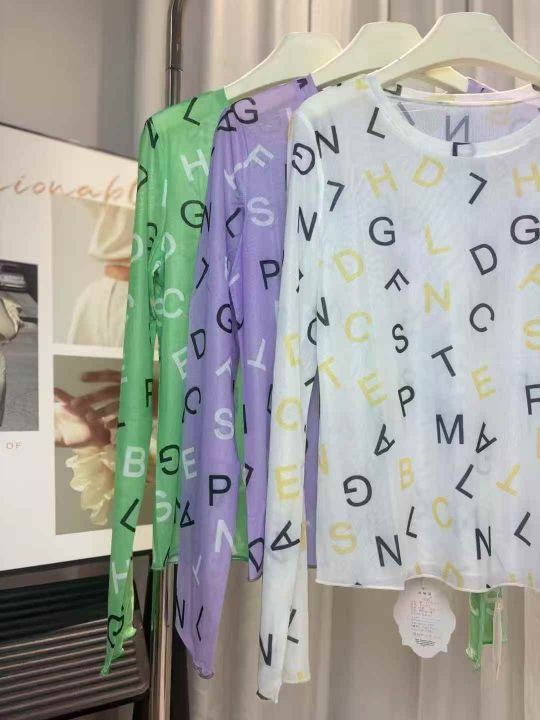 70件满印字母网纱打底衫女夏季薄款t恤圆领内搭长袖冰...