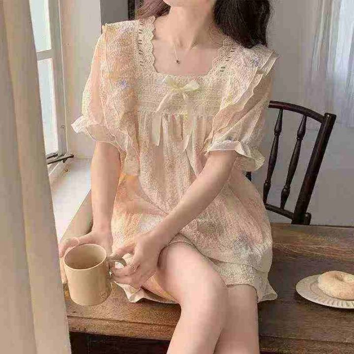 短袖甜美可爱公主风新款宽松蕾丝花边睡衣家居服,一个...
