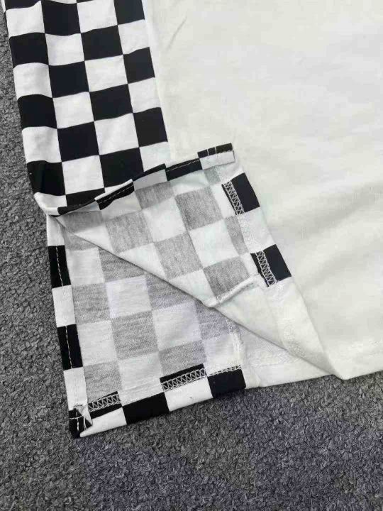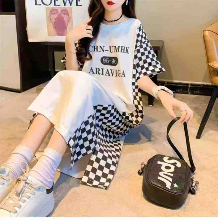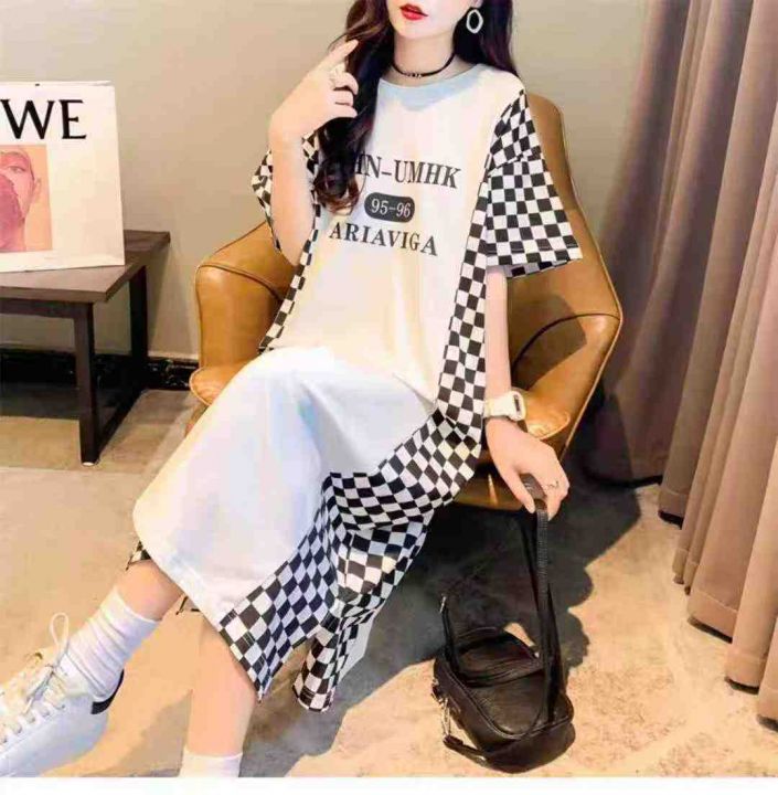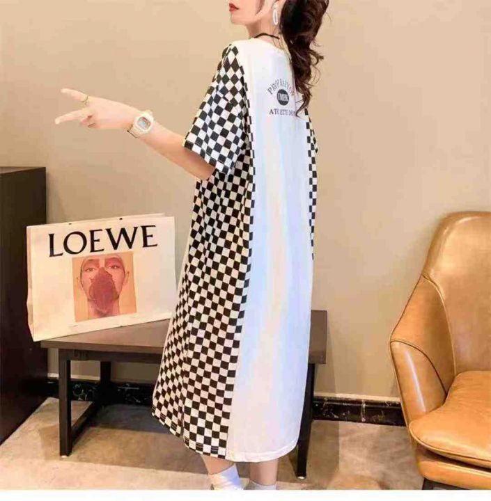 ☕️纯棉大码拼接格子长款过膝短袖T恤夏季韩版慵懒风...