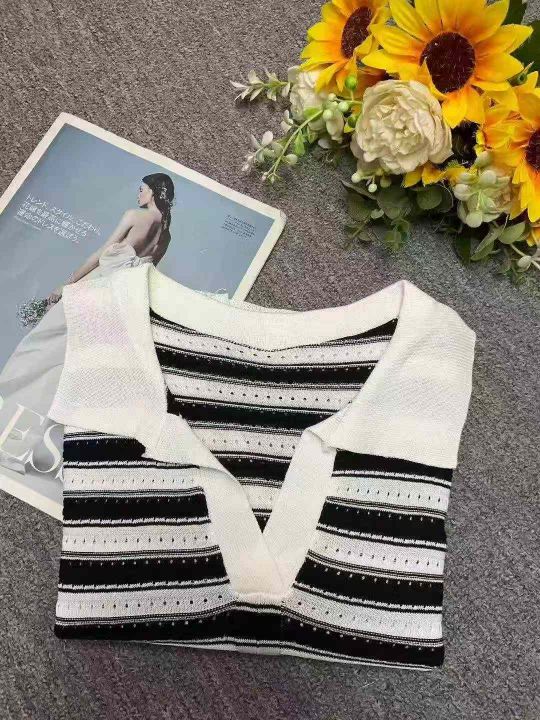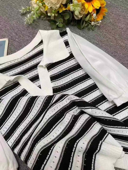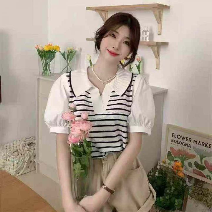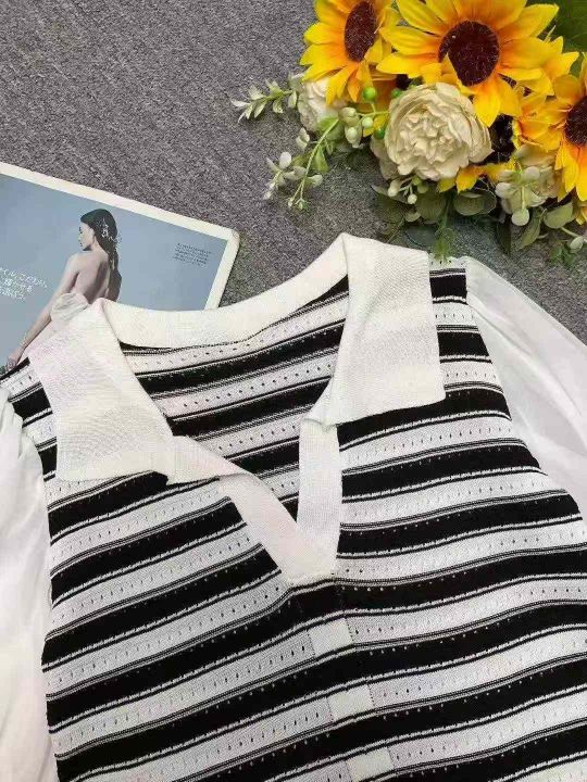 夏季新款冰丝条纹Polo领假两件雪纺拼接袖针织短袖T桖...