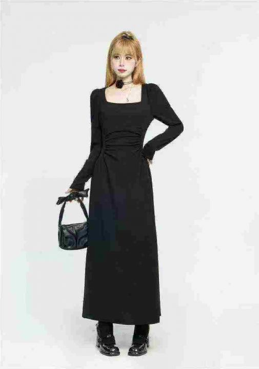 赫本风黑色方领连衣裙63件9.9,面料舒适,褶皱收腰,...