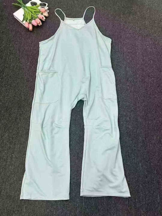 欧美大码V领胖MM浅绿色口袋宽松休闲吊带连体裤,独立包装,700件,S-2XL,全清3.9分货➕1