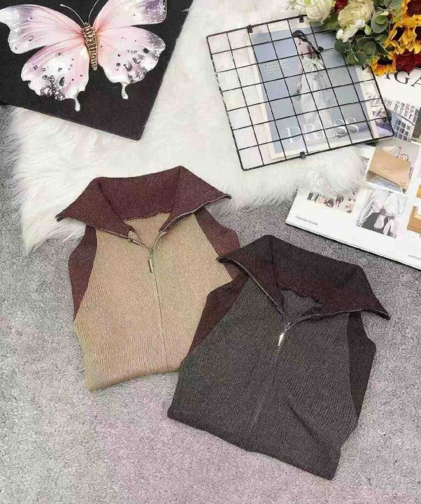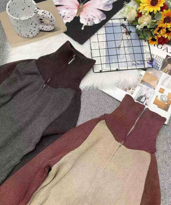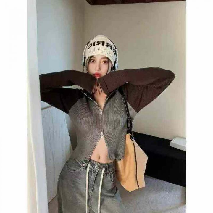 春季新款撞色插肩双头拉链辣妹设计感弹力修身针织毛衣...