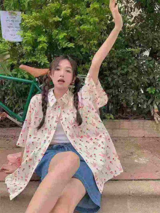 [月亮]:港味甜美兔子满印宽松短袖衬衫