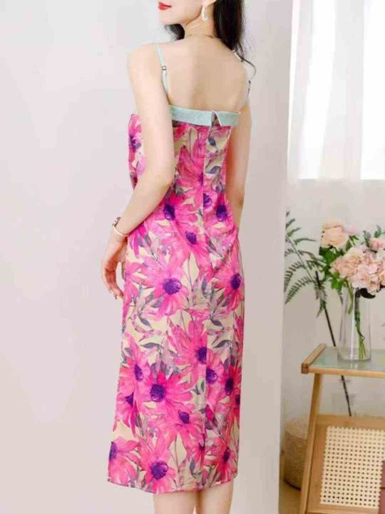 法式复古碎花拼接吊带连衣裙女士夏季新款气质修身高端...
