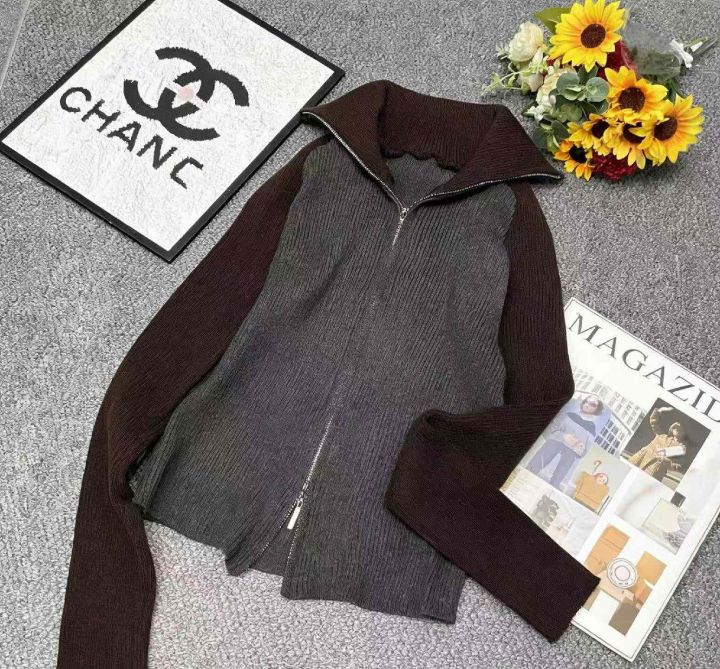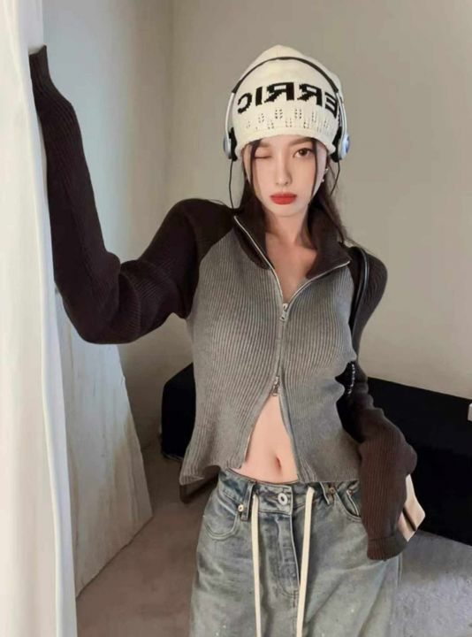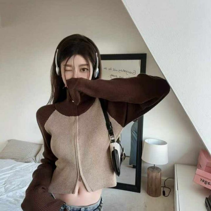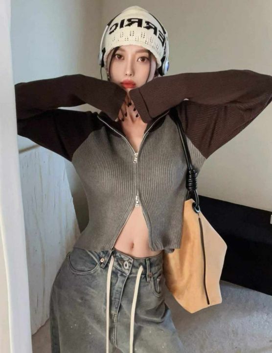 春季新款撞色插肩双头拉链辣妹设计感弹力修身针织毛衣...