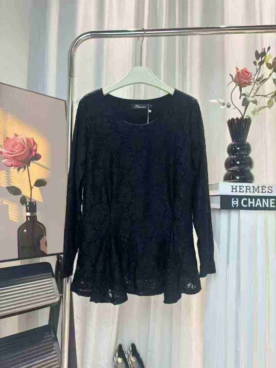 220件春季复古中长款下摆收褶设计圆领蕾丝风长袖大码T...