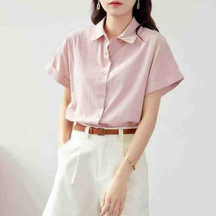 ☕️全棉粉色短袖衬衫女新款夏季白衬衣职业通勤女装穿...