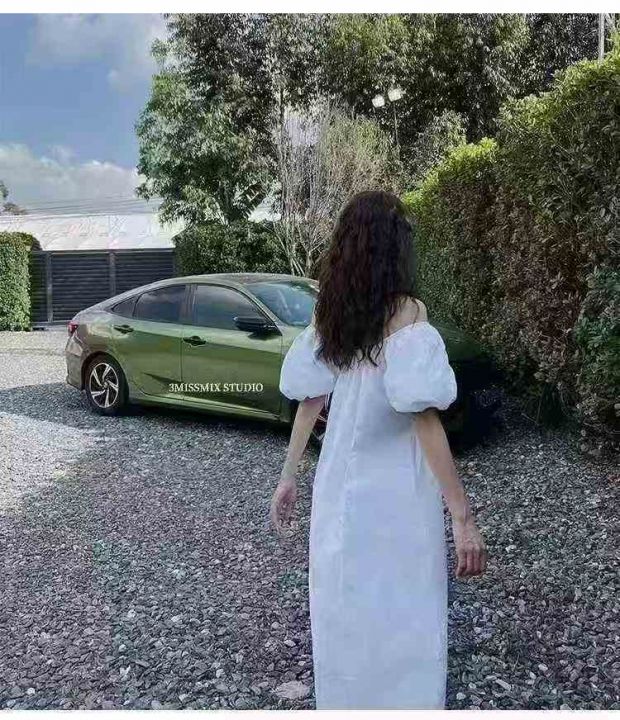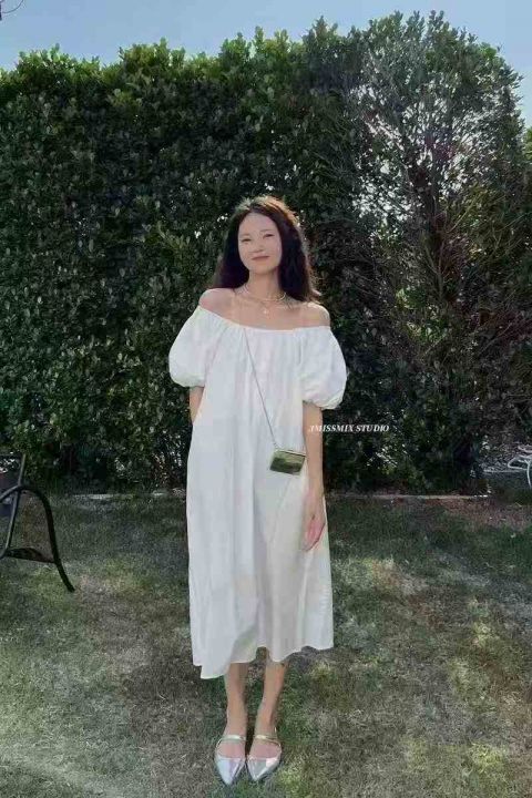 43件天猫在售冷淡风白色仙女裙子茶歇裙一字领露肩性感...