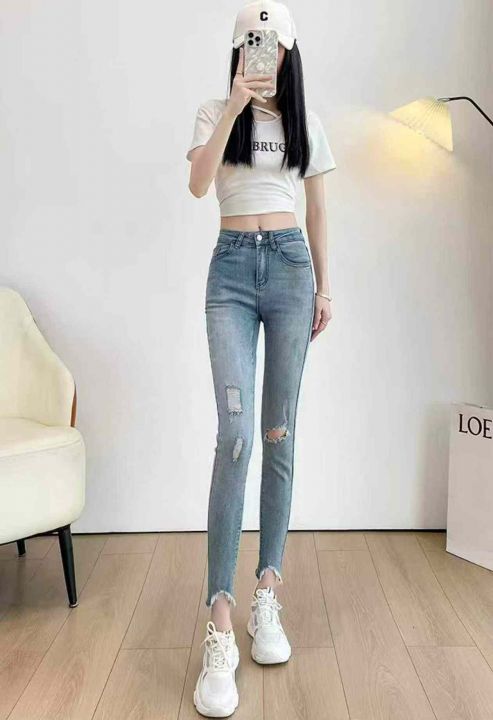 春夏季新款高弹力网红复古洗水棉破洞9分牛仔小脚裤,...