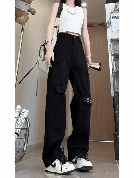 春季新款美式vibe风黑色微胖MM破洞窄版直筒阔腿牛仔裤...