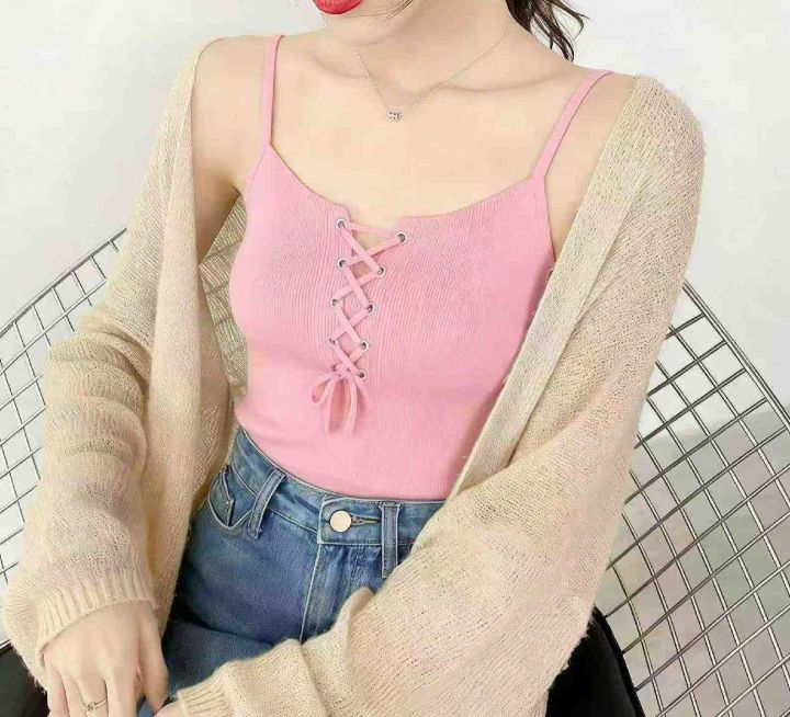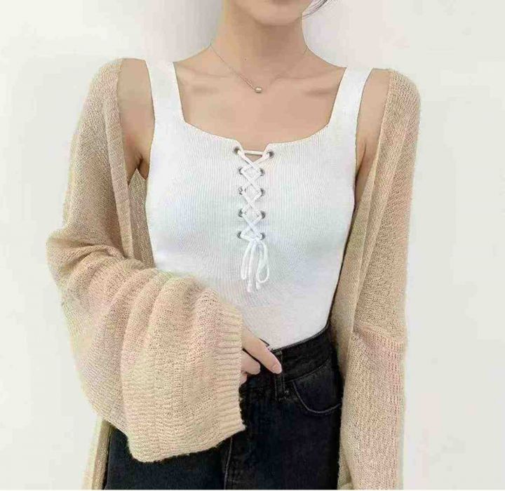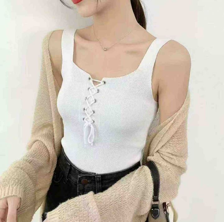 夏季新款韩系净版简约绑绳设计款冰丝针织吊带背心,独...