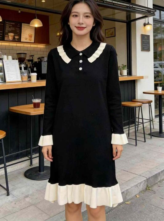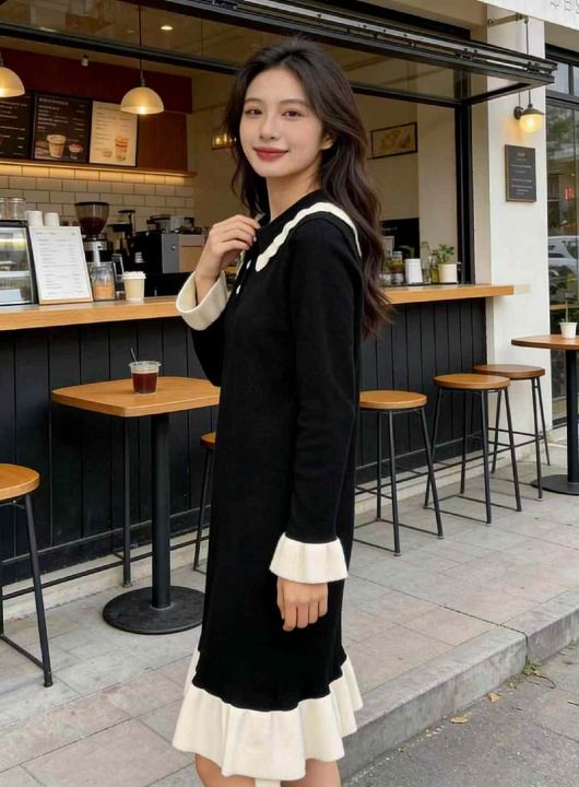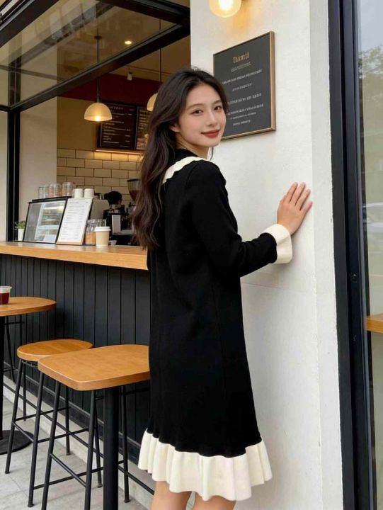 秋冬新款法式复古宽松百搭撞色娃娃领包芯纱毛衣连衣裙...