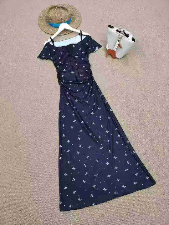 [月亮]:气质蕾丝边蝴蝶结印花假两件连衣裙