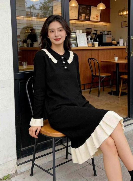 秋冬新款法式复古宽松百搭撞色娃娃领包芯纱毛衣连衣裙...