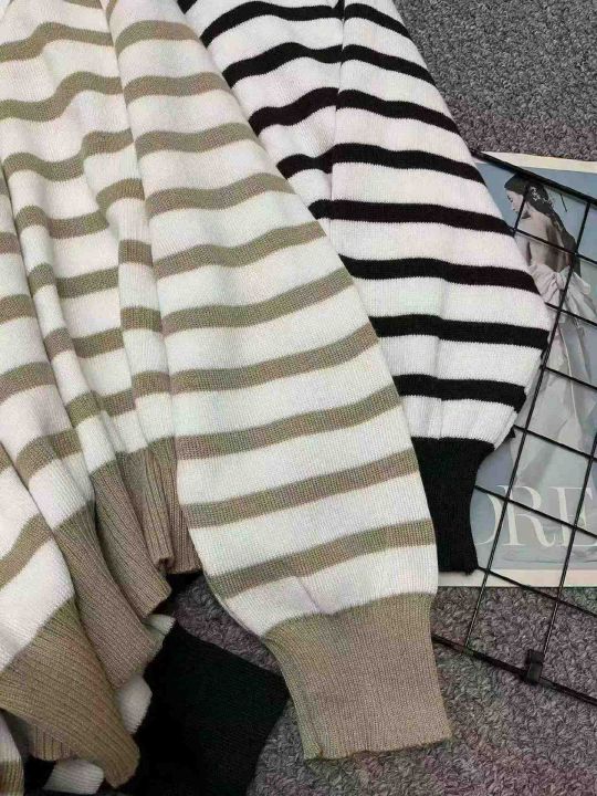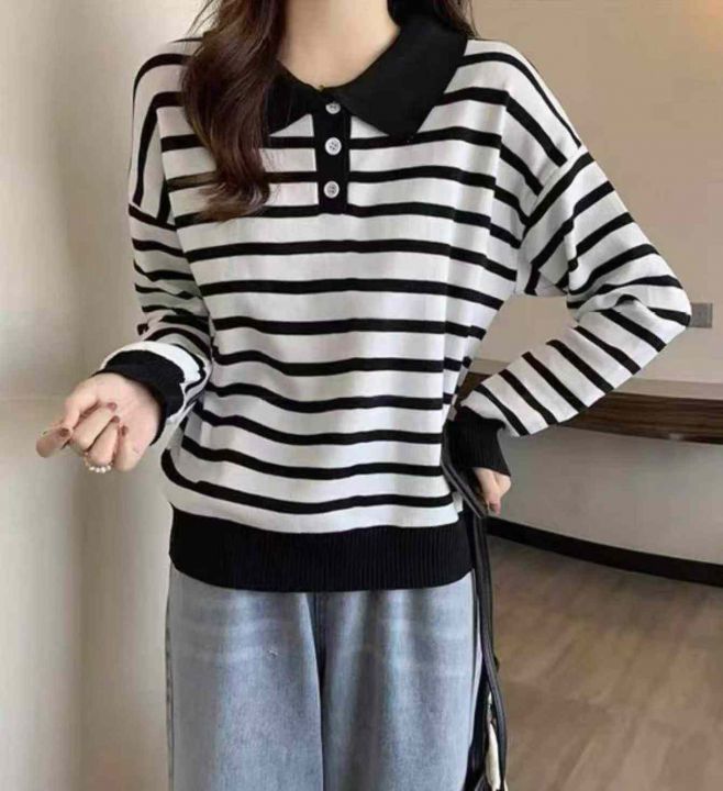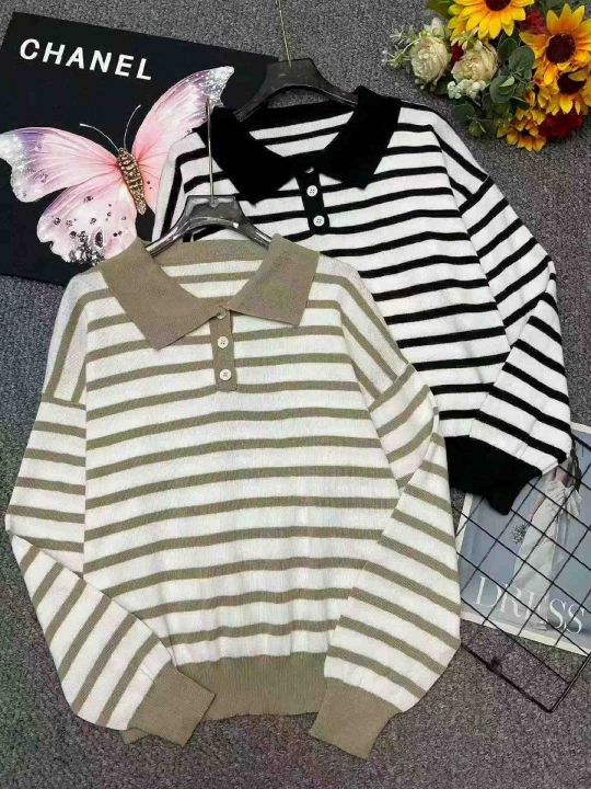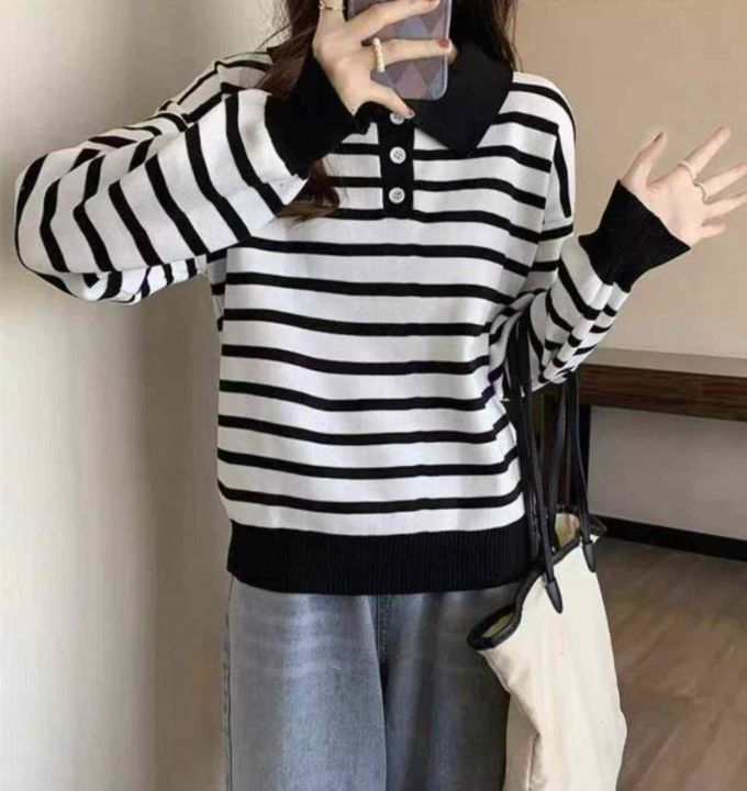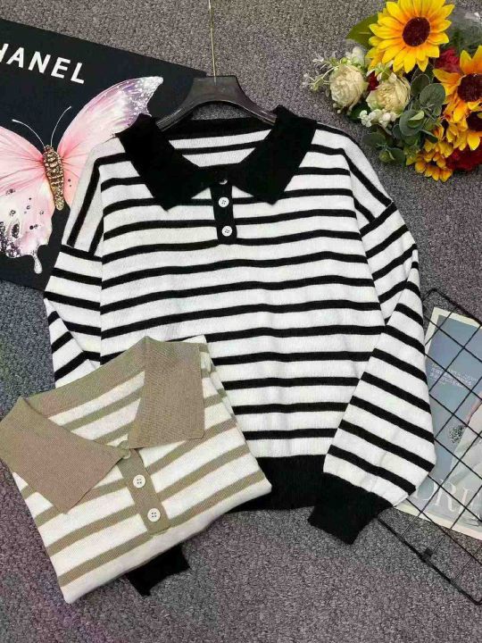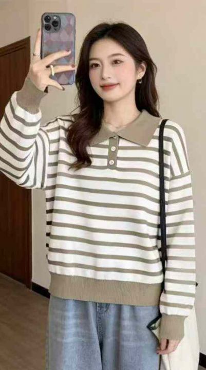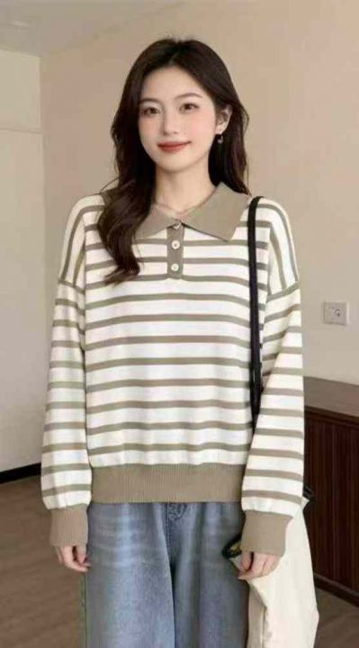 春季新款韩系翻领撞色条纹百搭宽松休闲长袖针织衫,独...