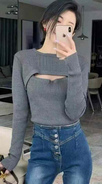 春季新款辣妹性感设计款针织毛衣2件套,独立包装,均...