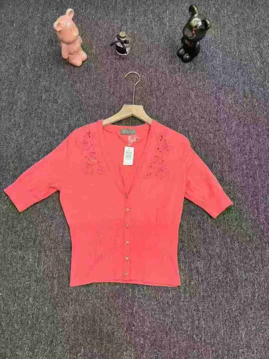 外贸原单春秋女士开衫提花西瓜红半袖中袖V领修身收腰...