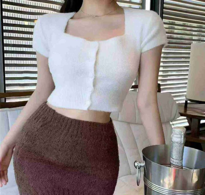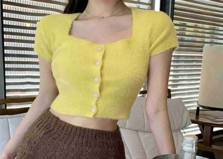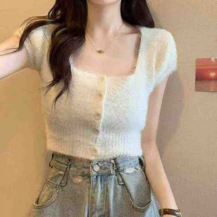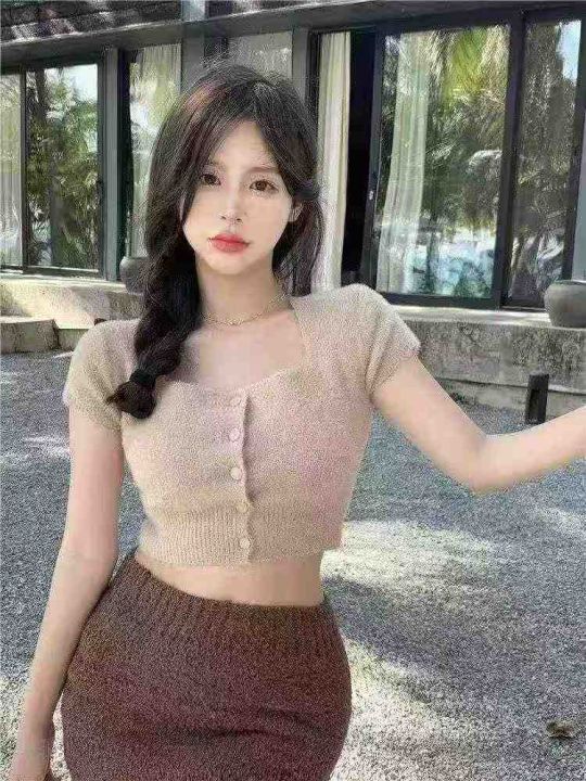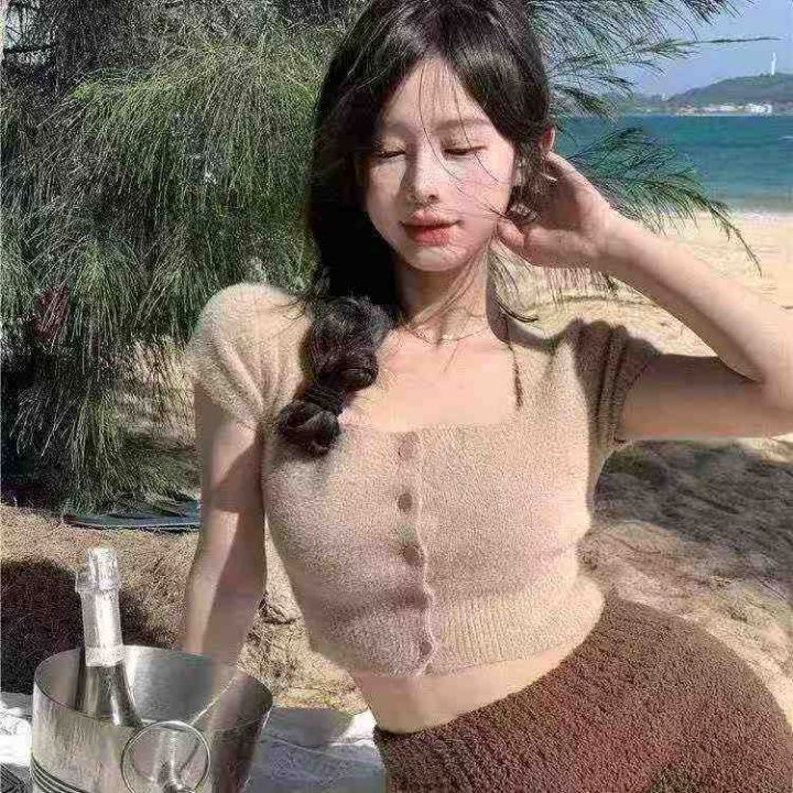 春夏季新款净版简约防水貂辣妹性感短款针织短袖开衫,...