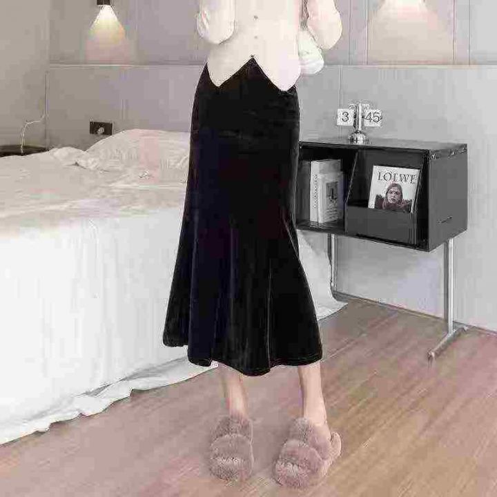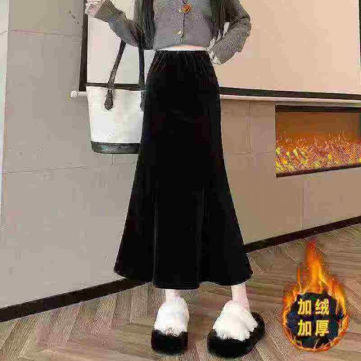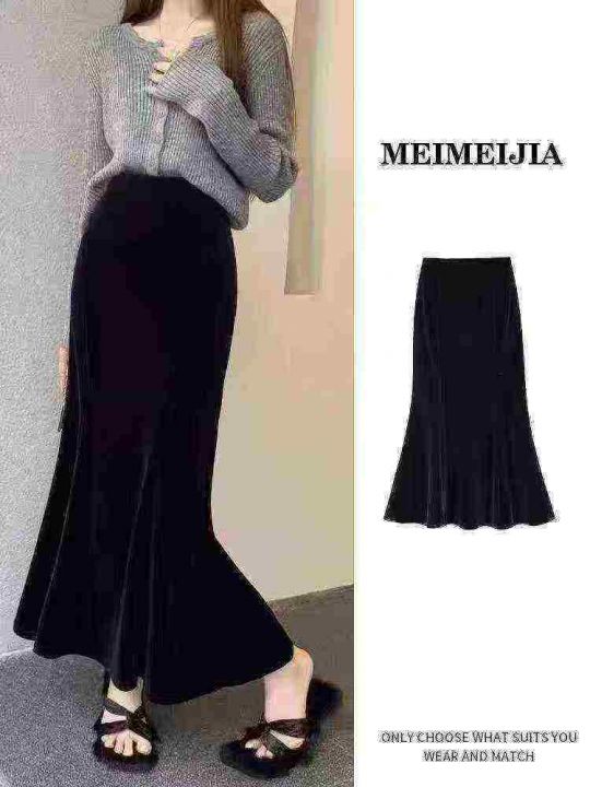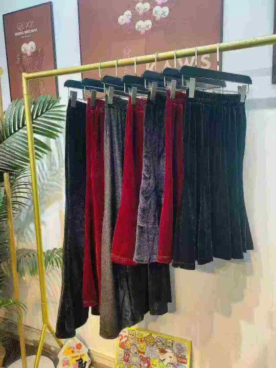 1238件半身裙金丝绒鱼尾裙修身显瘦包臀秋冬装光泽垂感松紧腰高腰长裙,单款两色 黑色为主,两种长度:过膝中长款 长款到脚面,长短款各半 加绒不加绒各半,码数S-3XL码 独立包装。