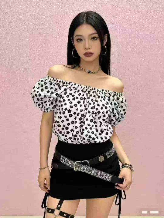 时尚百搭女士碎花雪纺圆领一字领露肩洋气短袖上衣.单...