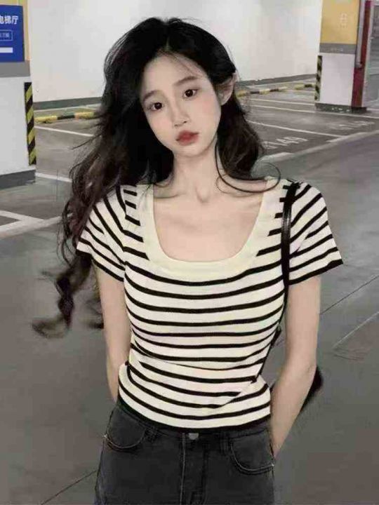 ☕️黑白条纹短袖u领露锁骨针织t恤女夏天薄款高级感正...