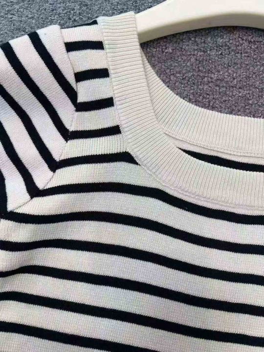 ☕️黑白条纹短袖u领露锁骨针织t恤女夏天薄款高级感正...