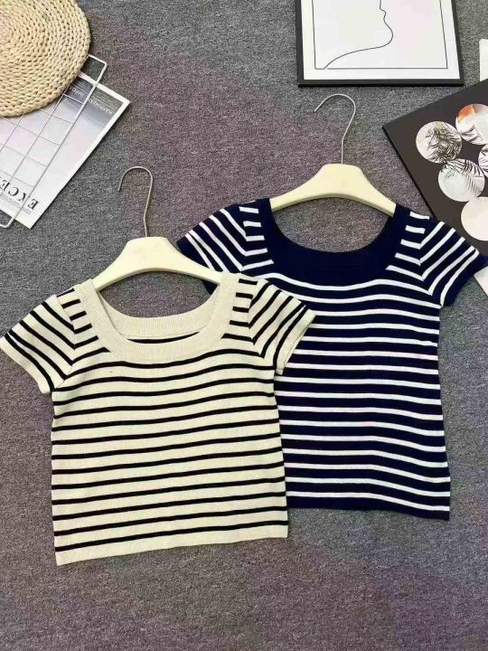 ☕️黑白条纹短袖u领露锁骨针织t恤女夏天薄款高级感正肩冰丝上衣280件全清7.8元 ,分货8.8元,均码高弹力,单款2色,辣妹针织条纹T恤[庆祝][庆祝][庆祝]