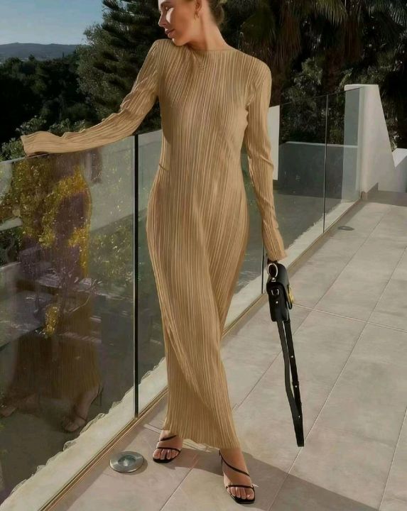 春季新款品牌外贸原单美式三宅弹力褶皱大长款连衣裙,...