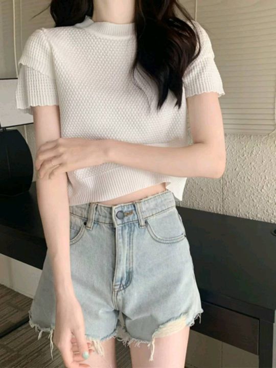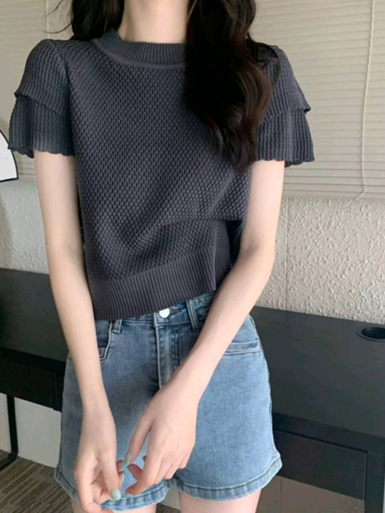 夏季新款女装设计感洋气泡泡袖圆领显瘦时尚短袖针织衫...