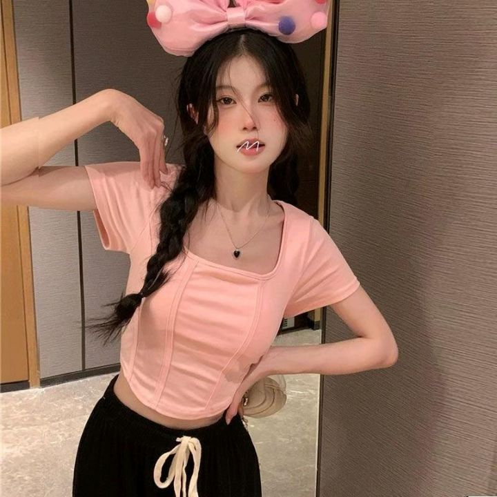 夏季新款辣妹纯欲鱼骨u领正肩弹力修身短袖T桖,独立包...