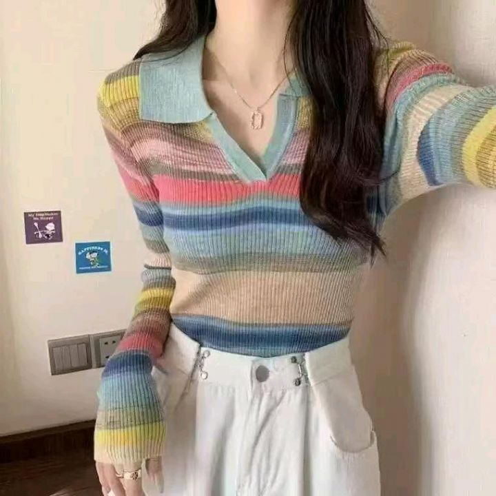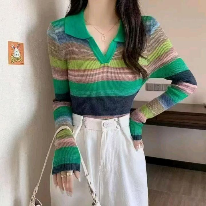 秋季新款POLO领撞色彩虹条纹微胖MM设计感时尚宽松长袖套头毛衣羊毛衫,独立包装,均码宽松款面料软糯Q弹,1800件,全清8.9元超低价秒杀!分货加一!