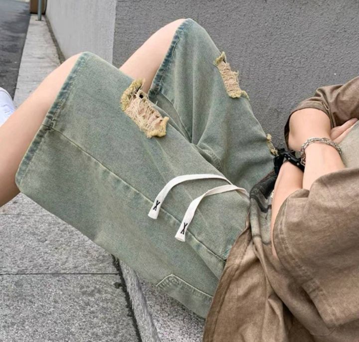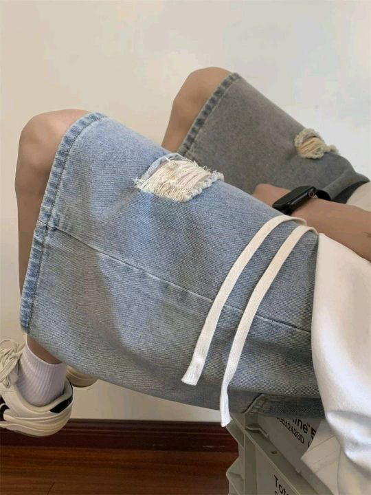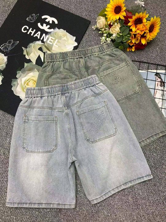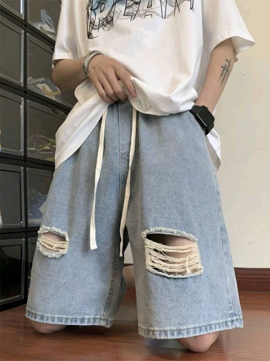 夏季新款水洗破设计感小众美式高街松紧腰牛仔短裤,独...