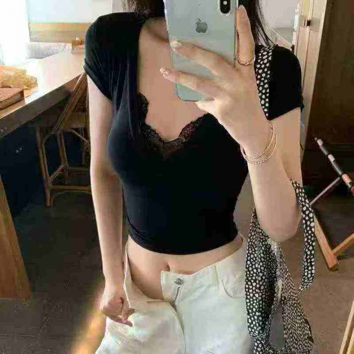 675显瘦性感纯欲V领蕾丝短袖T恤女夏昆士兰平纹辣妹正肩上衣,码数smlxl,独立包装,分货➕1,货号001#31