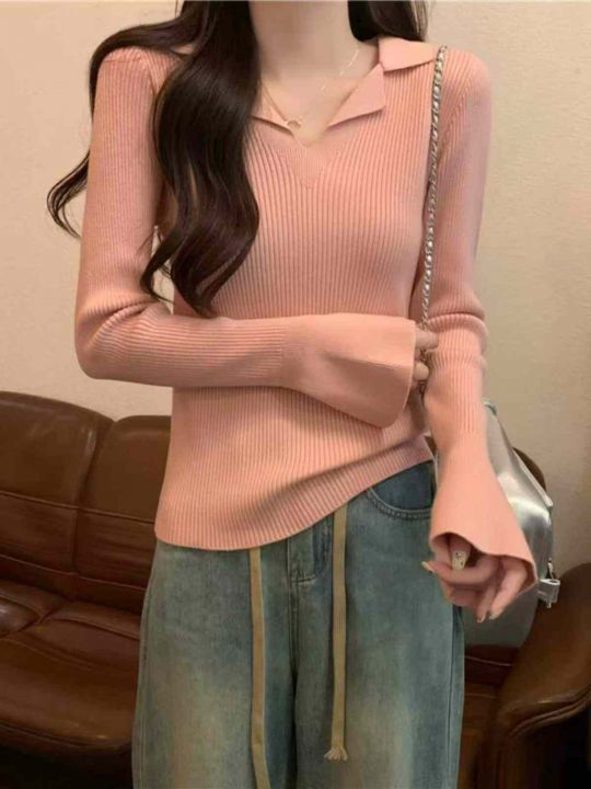春秋新款法式复古净版简约宽松Polo领坑条包芯纱套头毛衣,独立包装,均码面...