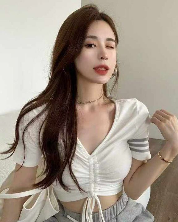 夏季新款纯欲风辣妹v领设计感抽绳小心机针织短袖小衫,独立包装,均码面料...