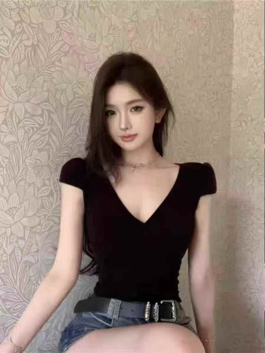 19000多件纯欲性感低胸v领泡泡短袖t恤女夏季甜辣妹绝美显身材修身上衣,尺码S~4XL,面料软糯高弹力,福利秒杀3.8